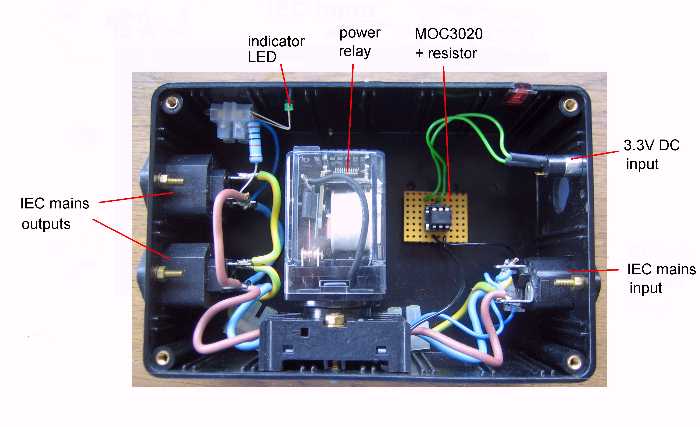I built mine into a box containing an IEC mains input socket, a 3.5mm jack socket to receive the 3.3V signal, and a couple of IEC mains output sockets to send power to my active speakers. The power relay is a heavy duty long life type able to switch 10A at 240VAC - smaller (and cheaper) power relays can be found if your current draw requirements are more modest. There's also an indicator LED to show when the power is on, fed with 240VAC from one of the output sockets (with a 100 kohm resistor in series to step the voltage down to the required level). Here's a picture of the device with its lid removed: