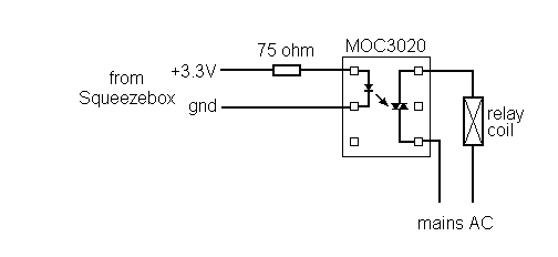 To switch the (very small) AC current required by the relay coil, we're going to use an opto-coupled triac. This is a device (often packaged in a 6-pin DIL format) that contains a triac, a LED and a photodetector. When a DC voltage of about 1.2V is applied to the LED, it emits light that causes the photodetector to switch on the triac, thus allowing the AC current to pass. The headphone/IR output on a Squeezebox/Transporter is more than capable of delivering the very small current drawn by the LED.