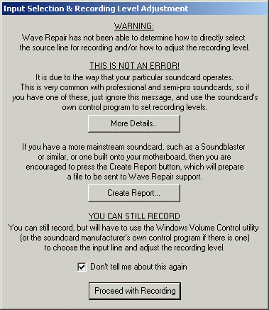 Realtek SoundcardsMost mainstream soundcards provide multiple inputs from which to record (mic, line, aux, etc). Traditionally, the input to be recorded is selected by a control in the soundcard's driver called a "multiplexor" or a "mixer". A multiplexor allows for recording through only one input at a time, while a mixer allows more than one input to be active if desired. Wave Repair is aware of these strategies, and it interfaces with multiplexors and mixers to allow direct selection of recording input and adjustment of recording level.The drivers for many Realtek-based soundcards operate differently. Rather than allowing one or more inputs to be activated for recording, they instead record from all inputs simultaneously and allow for specific inputs to be switched off if not wanted. So rather than having a multiplexor or mixer control, they instead have multiple "mute" controls. It is this different strategy that Wave Repair currently does not recognise. I am aware of this situation and hope to add the Realtek strategy in a future release. The upshot of this is that for the time being, while Wave Repair will happily record whatever signal is being supplied throught a Realtek soundcard, it cannot provide the facility to select the input and adjust the level. You will have to use the Windows Volume Control utility instead. This utility is invoked via Start > Programs > Accessories > Entertainment > Volume Control. (There is often a shortcut in the system tray; the icon looks like a loudspeaker cone). When Volume Control first starts up, it shows the controls for playback, not recording. You will need to switch to the recording controls via Options > Properties. So, if you see this warning screen pop up: